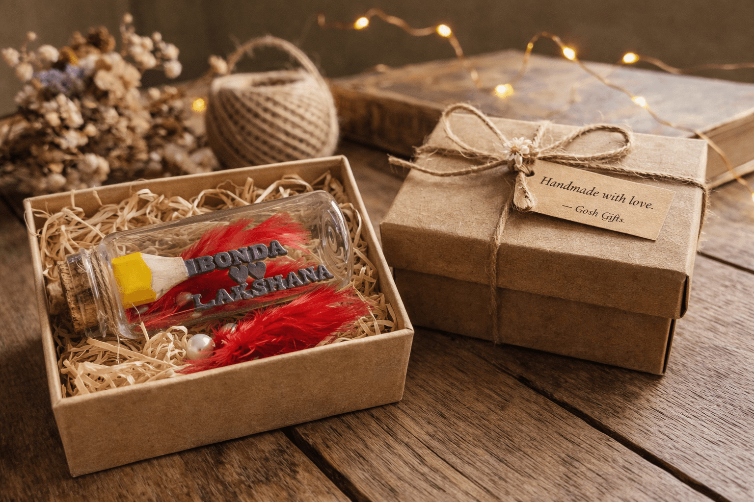 Celebrate love in the most unique way with this handmade pencil carving bottle gift. Carefully crafted with precision, this miniature artwork features beautifully carved names inside a tiny glass bottle, creating a meaningful keepsake that captures a special bond. Each piece is meticulously handcrafted, making every gift truly one-of-a-kind. The delicate pencil carving is placed inside a glass bottle and decorated with soft feathers and pearls, giving it a charming and romantic look. This thoughtful gift is perfect for couples, anniversaries, proposals, birthdays, or special occasions. Its small size and intricate design make it a memorable token of love that can be displayed on a desk, shelf, or bedside table. A tiny bottle carrying a big story of love, creativity, and craftsmanship.