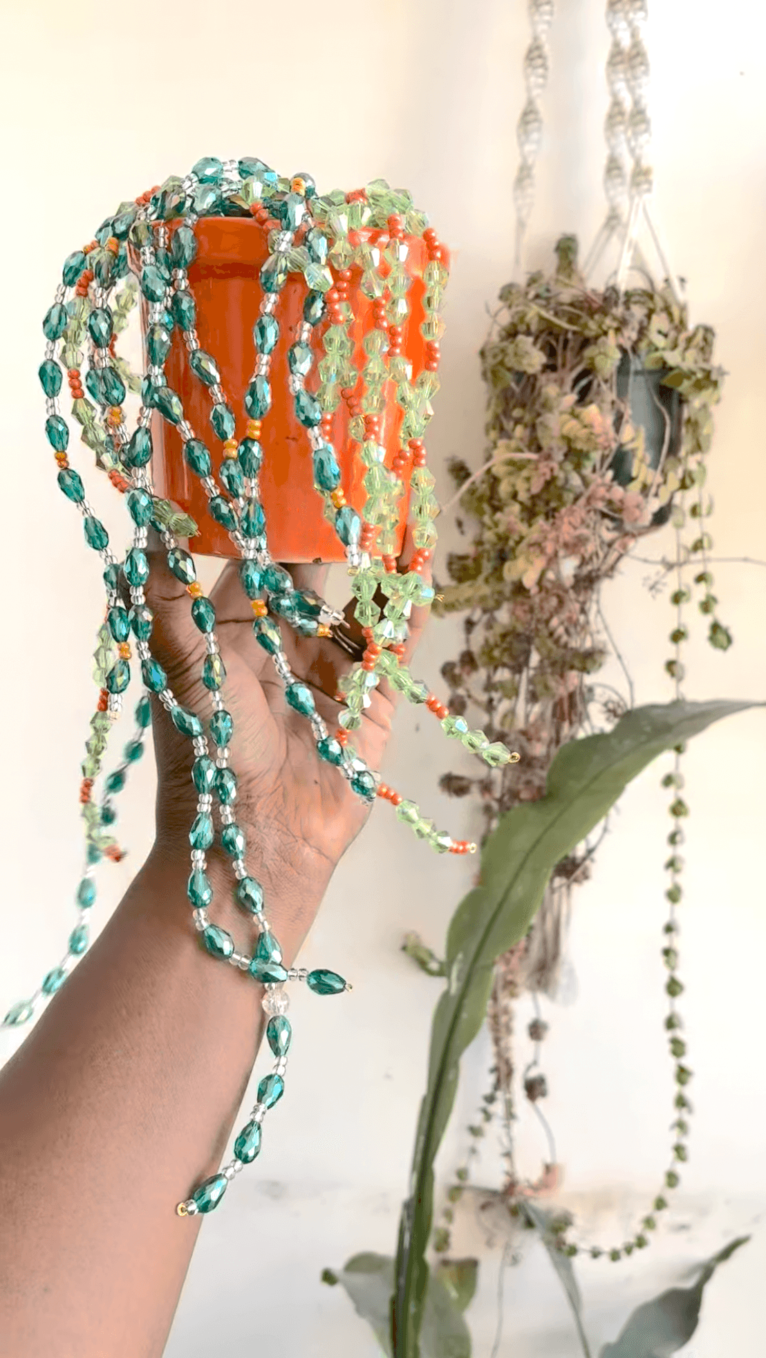 Bring the lush beauty of a trailing plant into any corner of your home—no sunlight or watering required. This handmade Prism-Leaf Cascade is a meticulous recreation of a Curio radicans (String of Bananas), reimagined through a bohemian, maximalist lens. Dozens of hand-strung strands featuring faceted emerald and peridot glass beads that catch and refract the light like a sun-catcher. Nestled in a vibrant, high-gloss orange terra cotta pot, the warm vessel perfectly complements the cool greens of the "foliage." Perfect for low-light bookshelves, humid bathrooms where real plants struggle, or as a statement piece for the "black thumb" who loves greenery.