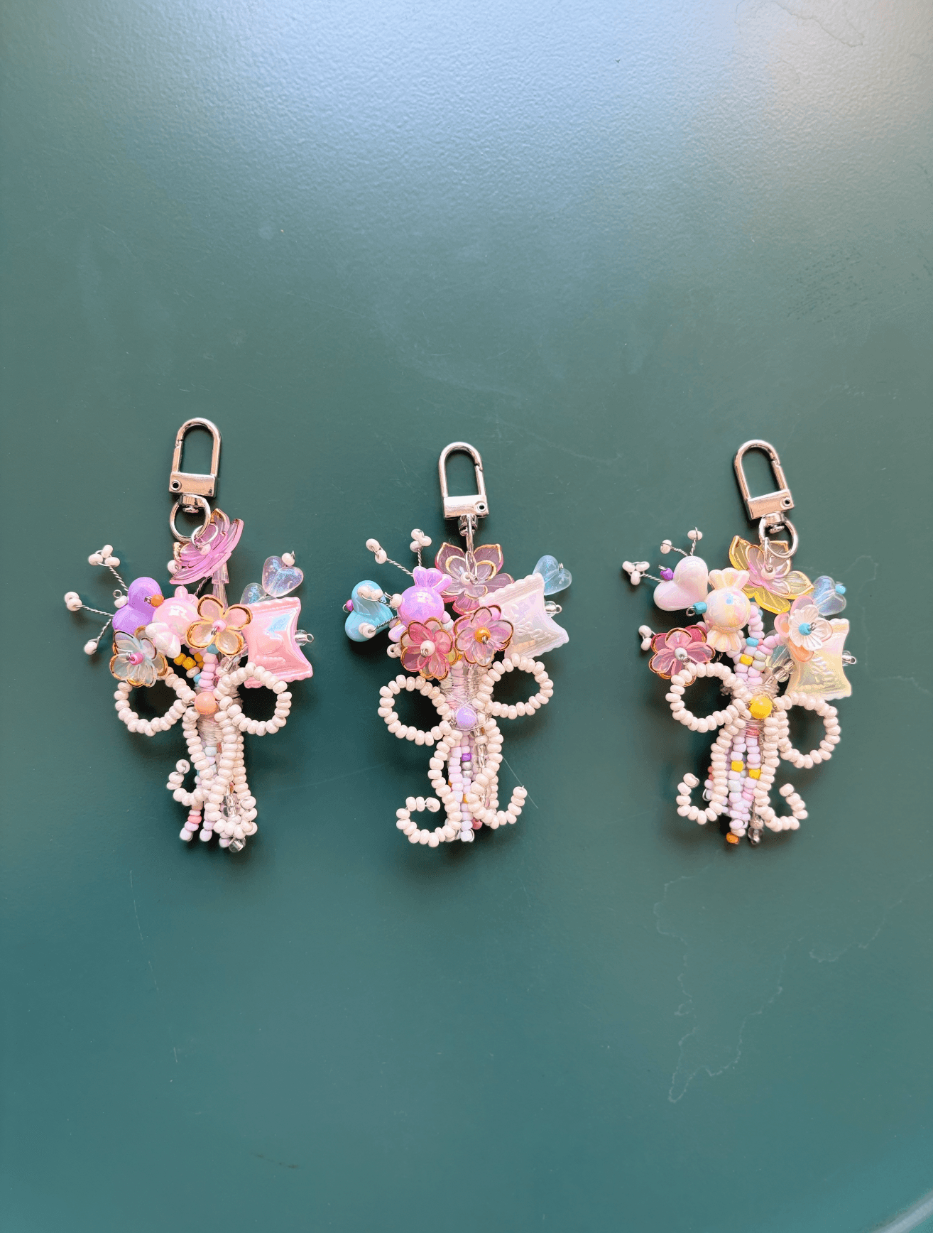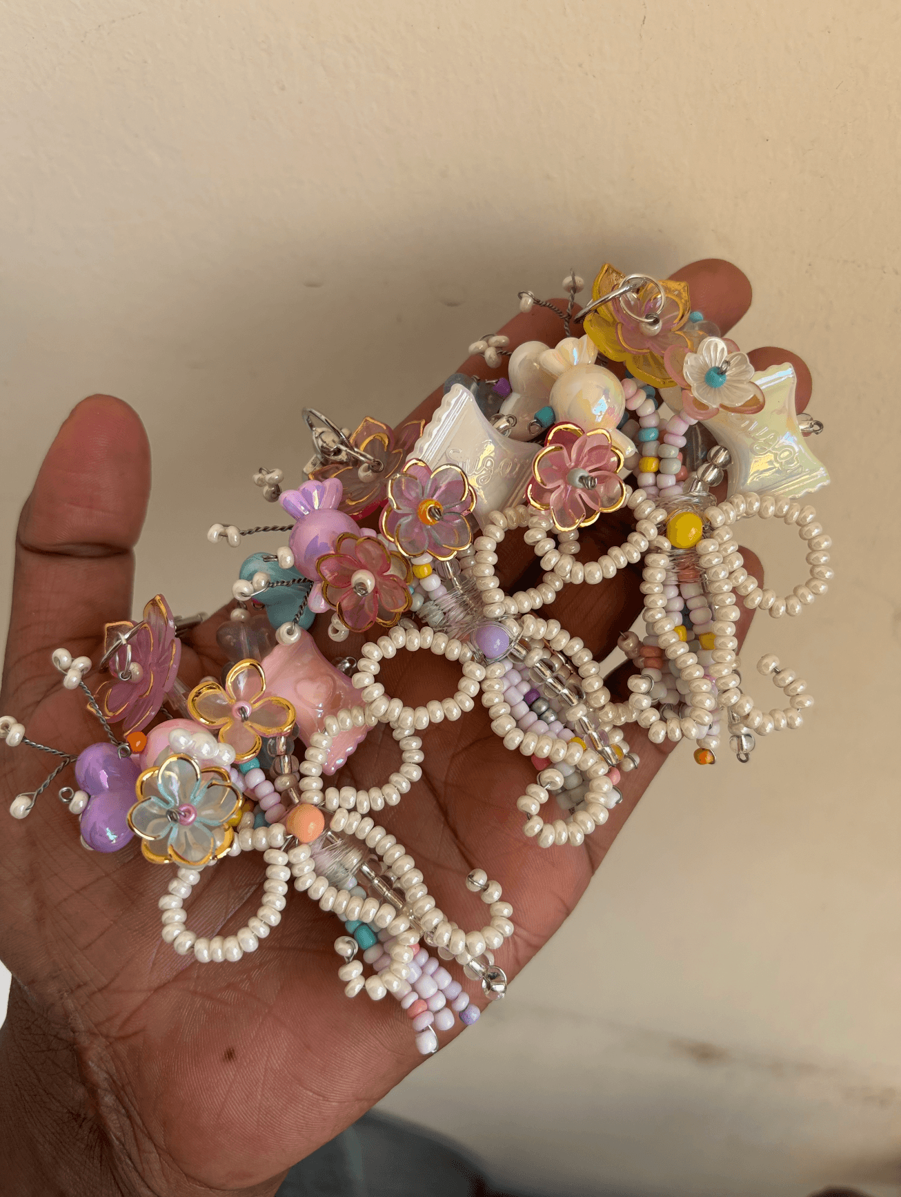 A delicate handcrafted bag charm featuring intricate beadwork in soft pastel tones, adorned with floral accents, whimsical details, and a playful yet elegant silhouette. Each piece is carefully assembled with hand-selected beads to create a dreamy, garden-inspired aesthetic—perfect for elevating your everyday bags or gifting something truly unique.